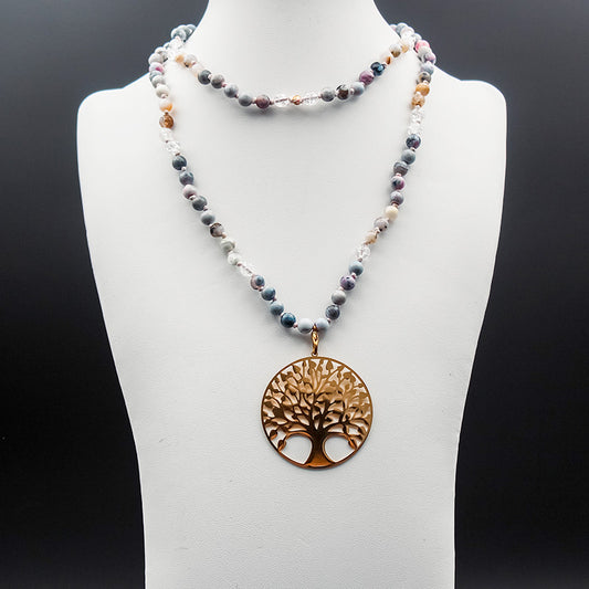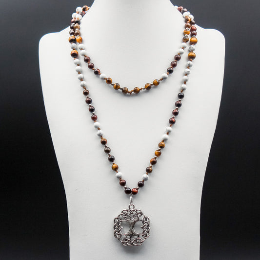 Mala - OEIL DE TIGRE et HOWLITE pendentif arbre de vie argente en acier inoxydable