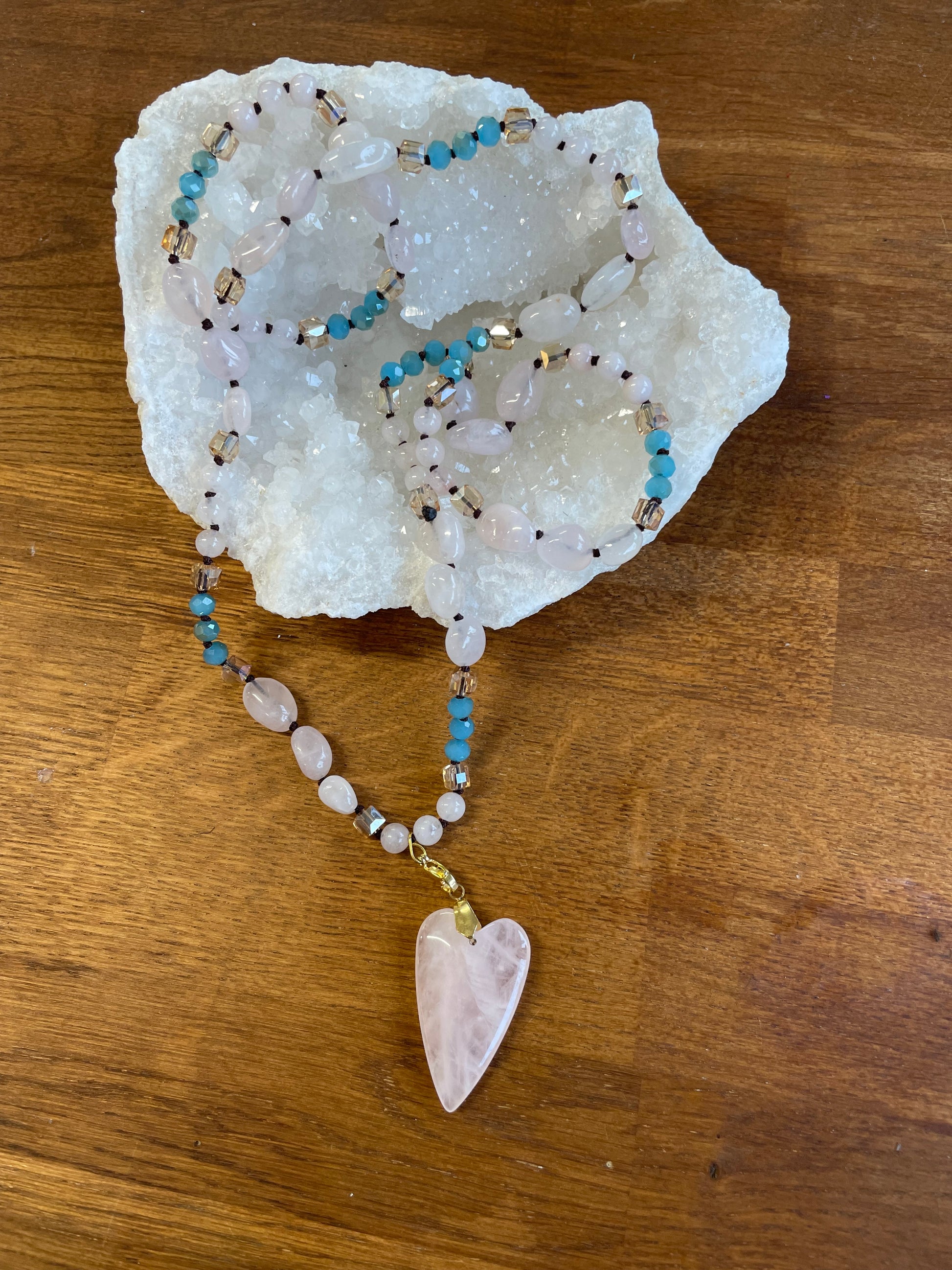Ce sautoir célèbre le quartz rose sous deux finitions distinctes, révélant toute la richesse de cette pierre de tendresse et d'amour. L'amazonite polie et taillée apporte une note de sérénité avec ses teintes apaisantes, tandis que le pendentif cœur allongé en quartz rose incarne l'intention émotionnelle de la composition. Cette dualité de travail du quartz crée un contraste textural subtil et sophistiqué. Prisé des lithothérapeutes et des amateurs de symbolique minérale, ce collier long favorise l'ouverture du cœur et l'équilibre émotionnel. Une pièce intemporelle pour cultiver la bienveillance et l'authenticité dans votre quotidien.