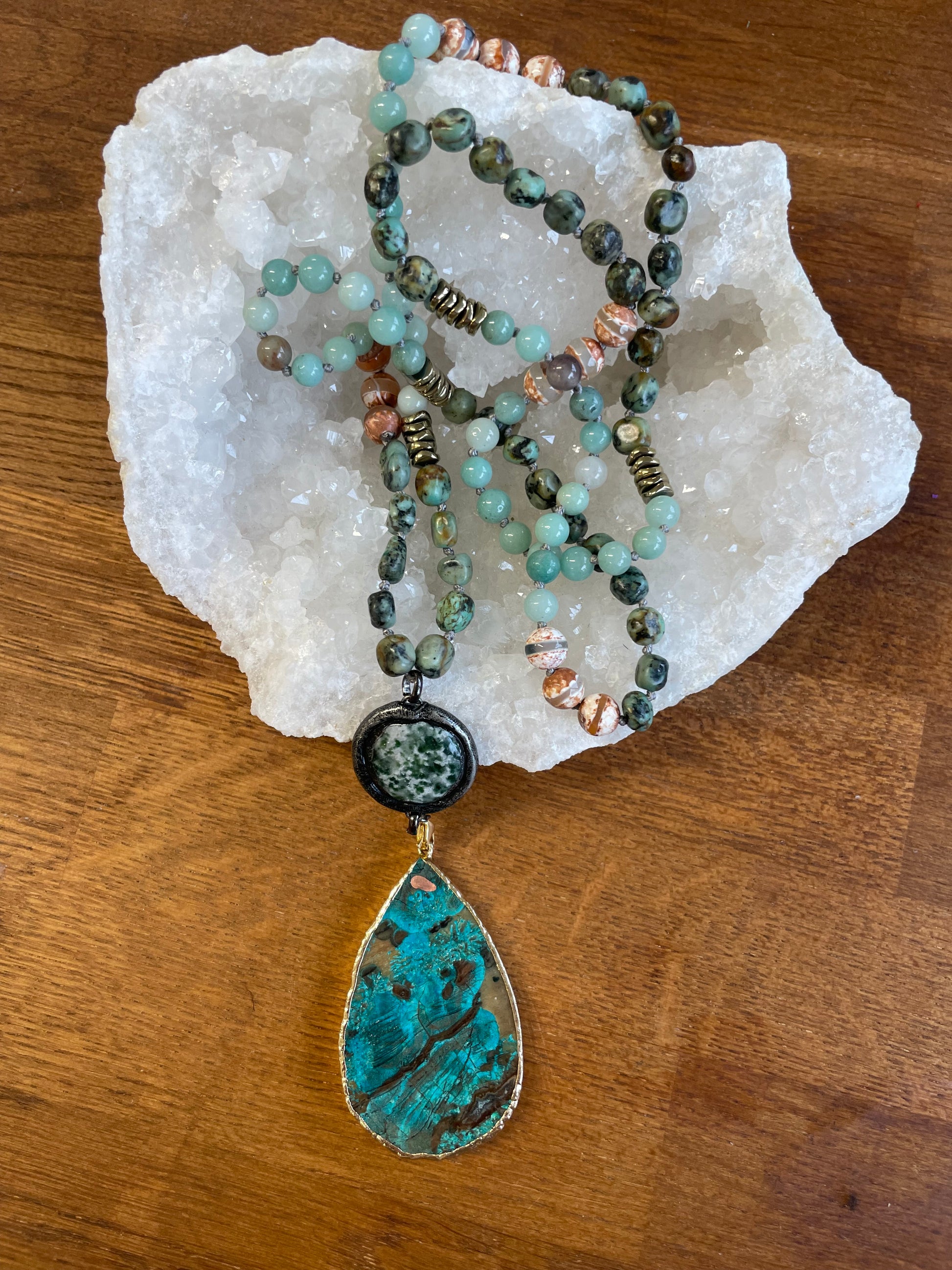 Ce sautoir conjugue trois pierres semi-précieuses d'exception : l'agate africaine aux teintes chaleureuses, l'amazonite aux reflets apaisants, et un pendentif en agate finement travaillé. Chaque élément révèle les caractéristiques géologiques distinctives de sa provenance, offrant une composition minéralogique remarquable. Parfait pour les collectionneurs et les connaisseurs, ce collier long incarne l'authenticité et la beauté brute de la nature. Une pièce de prestige pour affirmer votre passion pour les pierres naturelles.
